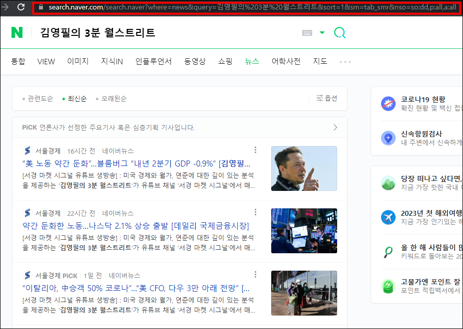 네이버 뉴스에서 검색한 URL을 이용하여 원하시는 내용의 뉴스 제목과 URL을 텔레그램 채팅방에 전송하는 코드를 작성해 보겠습니다. 예시로, 미국주식 관련 데일리 뉴스를 올려주시는 김영필 기자님의 뉴스를 크롤링하는 코드를 작성해 보겠습니다.