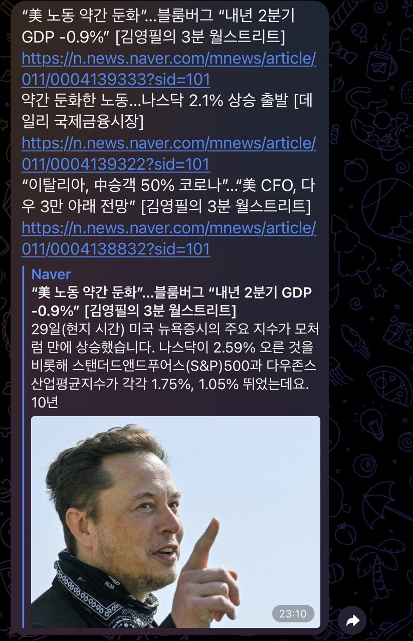 맨 처음의 네이버 검색결과 페이지와 텔레그램 채팅방의 뉴스 내용이 동일하게 나오는 것을 보실 수 있습니다.