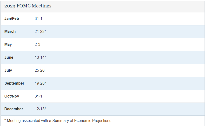 아래는 미국의 통화정책을 결정하는 FOMC 미팅의 2023년 일정입니다. 참고로, 현지시간 기준입니다.