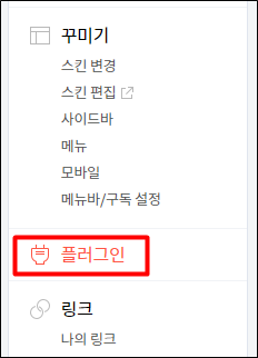 먼저, 운영하시는 블로그의 티스토리 관리에 들어가셔서 [플러그인] 메뉴를 선택해 줍니다.