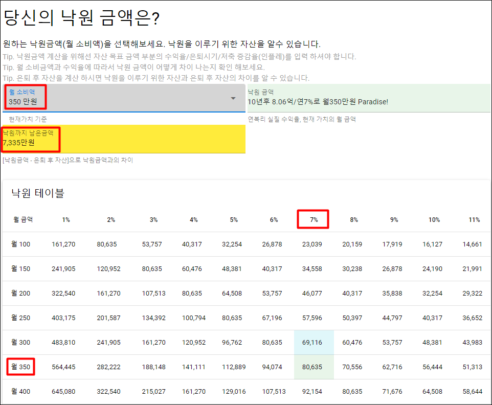 예제에 나와있는 대로 설정했더니 월 350만 원을 소비를 하고 싶을 경우 7,335 만원이 모자란 것을 알 수 있었습니다. 낙원 테이블을 봤을 때는, 월 300만 원이 소비가 가능한 것을 알 수 있었고(테이블의 하늘색 표시), 월 350만 원을 소비하기 위해서는 8억 635만 원이(테이블의 녹색 표시) 필요하다는 것을 알 수 있었습니다.