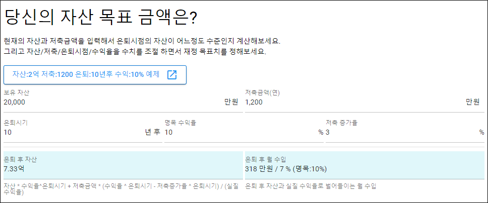 예제를 적용하여 나온 결과는, 은퇴 후 자산은 약 7억 원이라는 금액이 나오고, 은퇴 후 월 수입은 318만 원인 것을 알 수 있습니다.