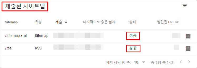 제출이 완료되면 '제출된 사이트맵'에서 사이트맵과 RSS가 등록이 된 것을 확인하실 수 있고, 조금 시간이 지나면 상태가 성공으로 바뀌게 됩니다. 성공으로 상태가 바뀌었다면 최종적으로 등록이 완료된 것입니다.