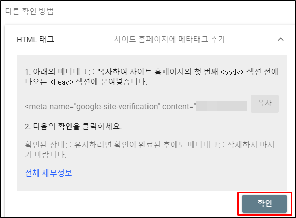 HTML 태그 방식을 눌러보시면, 메타 태그를 제공하는데요. 이 것을 복사하신 뒤 블로그의 head 섹션에 붙여 넣기 해주시면 됩니다. (※ 블로그에 메타 태그를 붙여 넣기 전까지 확인 버튼을 누르지 않고 창을 열어두셔야 합니다.)