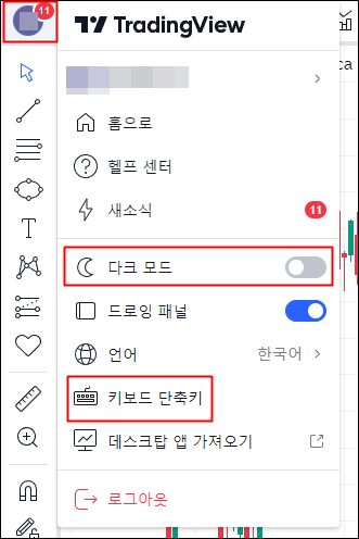 좌측 상단 계정 버튼을 누르시면 다크 모드를 설정하실 수 있고, 키보드 단축키를 누르시면 단축키들을 보실수가 있습니다.