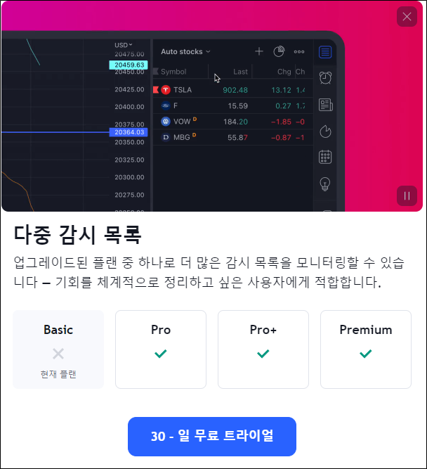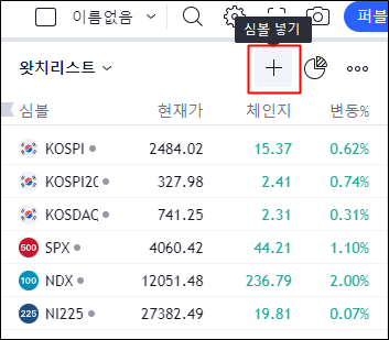 트레이딩 뷰 우측에 보시면 먼저, 왓치리스트가 보입니다. 왓치리스트에서는 [+] 버튼을 눌러 관심종목을 추가하실 수 있습니다.