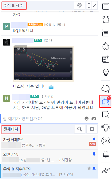 아래 창의 '전체 대화'에서 토론방을 고르신 뒤 위창에서 채팅을 진행하실 수 있습니다.