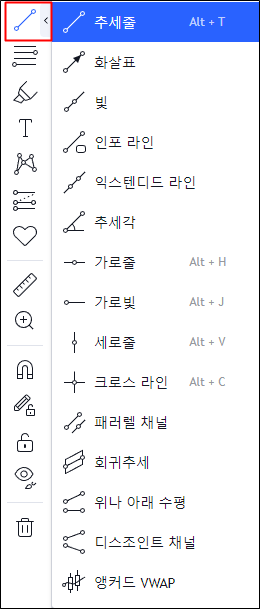 다음은 추세선 도구입니다. 여러 가지 추세선을 지원하며 자주 쓰이는 선들은 단축키로 지정이 되어있습니다. (추세줄, 가로줄, 가로빛 등의 추세선 바로 우측에 보시면 단축키가 안내되어 있습니다.)