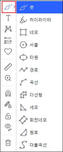 붓으로 자유롭게 그리거나 도형들을 그릴 수 있는 도구들을 제공하고 있는 메뉴입니다.