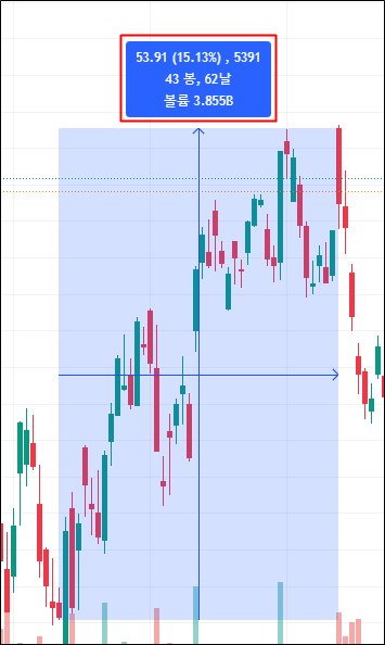 다음은 측정 도구인데요. 측정 도구 버튼을 누르신 뒤에 차트에 마우스를 가져가서 사용하셔도 되지만, [Shift] 단축키를 누르시고 차트를 클릭하시면 바로 사용하실 수 있습니다.