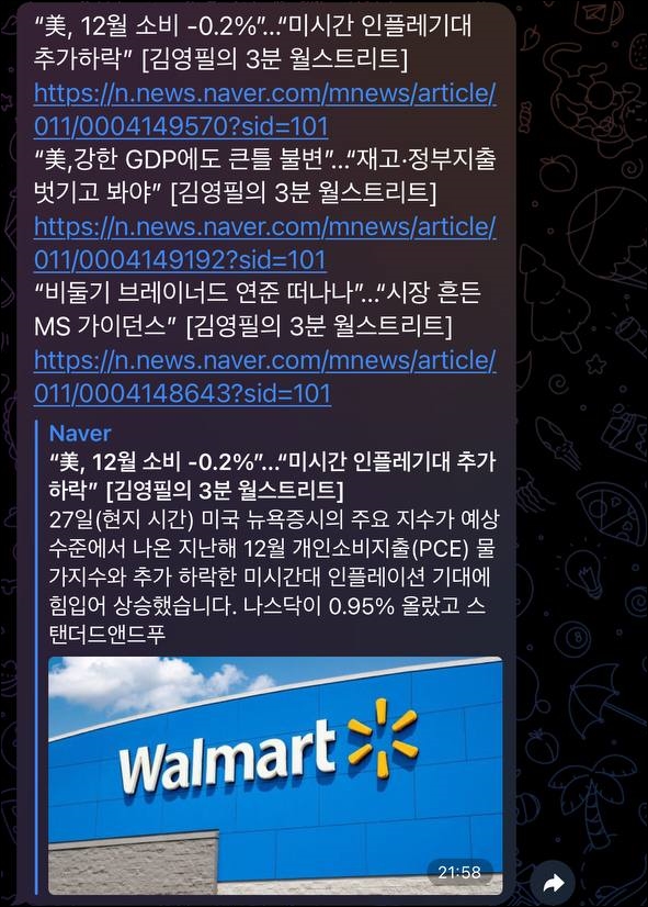 네이버 뉴스기사를 텔레그램 채팅방에 전송하기 안녕하세요. 오늘은 네이버에서 뉴스기사를 검색하여 해당 뉴스의 제목과 URL을 텔레그램 채팅방에 전송하는 코드를 작성하는 방법을 소개해드