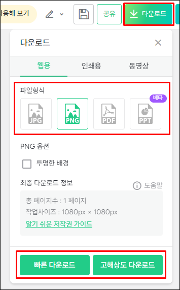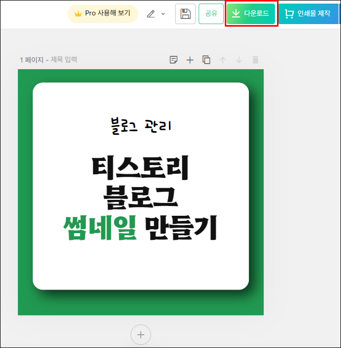 여러 요소와 텍스트를 이용하여 블로그 썸네일을 완성하셨다면, 우측 상단의 '다운로드' 버튼을 눌러 이미지 파일로 다운로드하실 수 있습니다.