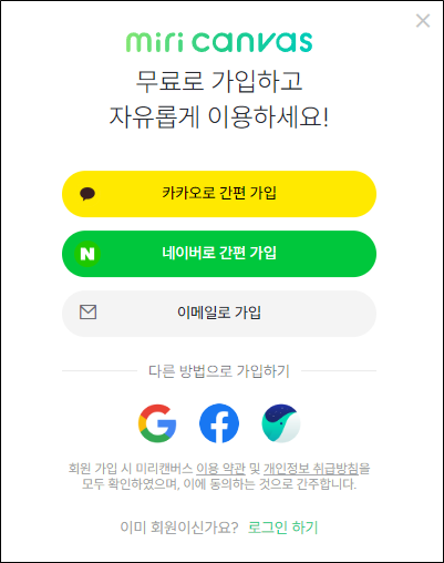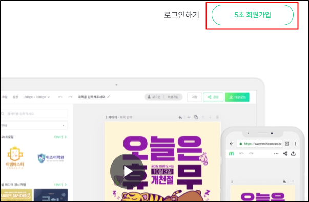 사이트를 접속하시면 바로 디자인 툴을 사용하실 수 있습니다. 하지만, 만들었던 썸네일들을 회원가입을 통해 로그인하시면 저장하실 수 있기 때문에 회원가입을 진행하시는 것을 추천드립니다.