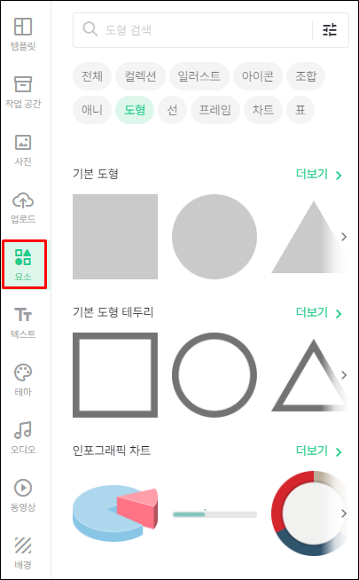먼저, '요소' 메뉴를 눌러보시면, 일러스트나 아이콘, 도형, 차트 등 여러 가지 요소를 넣을 수 있다는 것을 확인하실 수 있습니다. 이런 도형들을 이용해서 썸네일의 테두리를 만드는데 활용할 수 있을 것 같습니다.