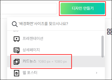 워크스페이스로 이동하셨다면, 상단 우측에 '디자인 만들기' 버튼을 눌러보시면 여러 사이즈를 고를 수 있는데요. 직접 지정하여 정사각형을 지정해도 되고, '카드뉴스' 사이즈가 정사각형 사이즈 이므로 카드뉴스 사이즈를 고르시면 되겠습니다.