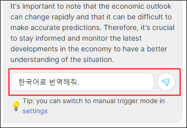 만약, 한국어로 결과를 확인하고 싶으시다면, 아래 입력란에 한국어로 번역을 추가로 요청하시면 되겠습니다. 다만, 번역을 요청하면 영어에 비해 출력 속도가 느리다는 단점이 있습니다.