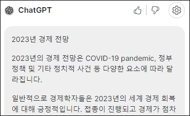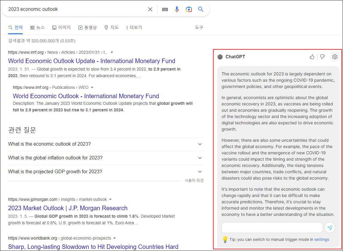 저는 '2023 economic outlook'을 검색해 봤는데요. 아래 사진처럼 구글 검색 결과가 표시되고, 우측에 ChatGPT도 잘 동작하는 것을 확인할 수 있었습니다.