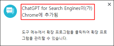 설치가 완료되었다면, 우측 상단에 확장 프로그램이 크롬에 추가되었다는 메시지가 표시됩니다. 확장 프로그램 사용은 설치와 동시에 사용 준비가 완료됩니다.