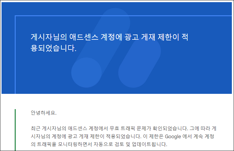 오늘은 제가 블로그를 운영하면서 겪었던 '애드센스 광고 게재 제한' 관련하여 어떻게 진행됐고, 지금은 광고 게재 제한이 해제가 되었는데, 어느 정도 기간이 소요되었는지, 또 광고제한의 주범인 무효트래픽 관리 방법에 대해 알아보는 시간을 가져보려고 합니다.