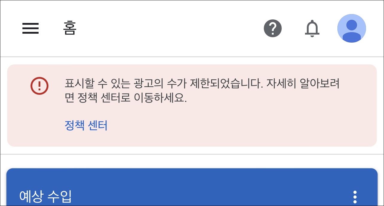 광고 제한 기간 동안은 애드센스 사이트 상단에 광고 수 제한 안내 메시지가 표시되며, 실제로 노출되는 광고 수가 적어지게 되어, 이 기간 동안 수익이 거의 발생하지 않았습니다.