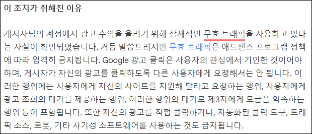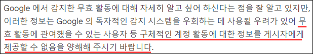 지금은 광고 제한이 해제되었지만 추후 무효트래픽이 발생하게 되면 또다시 광고가 제한될 수 있기 때문에 정확한 원인을 분석하여 대비하고 싶었으나, 아래의 광고 제한 안내 메일에서 확인할 수 있듯이 구글에서는 무효트래픽 관련하여 정보를 알려주고 있지 않았습니다.