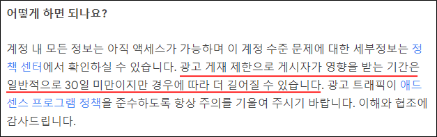 모니터링을 해본 결과, 블로그마다 다르겠지만, 광고 제한 일주일 정도 지나서부터는 평소대비 10분의 1 정도 수준으로 광고 노출이 되었고, 마지막 주에는 거의 평소 수준으로 광고가 표시되어 30일 정도가 지난 뒤에는 해제가 되는 것을 알 수 있었습니다.