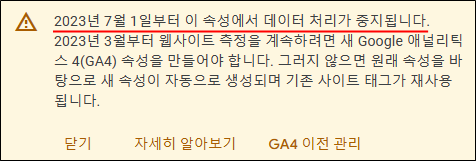단점으로는 애널리틱스의 속성이 현재 UA(유니버설 애널리틱스)와 GA4 속성이 존재하는데, 인터넷 검색을 통해 알 수 있는 대부분의 방식은 UA 속성 방식이 대부분이지만 UA 속성은 23년 7월 1일부터 지원이 중단되어 GA4 속성을 이용해야 한다는 점입니다.